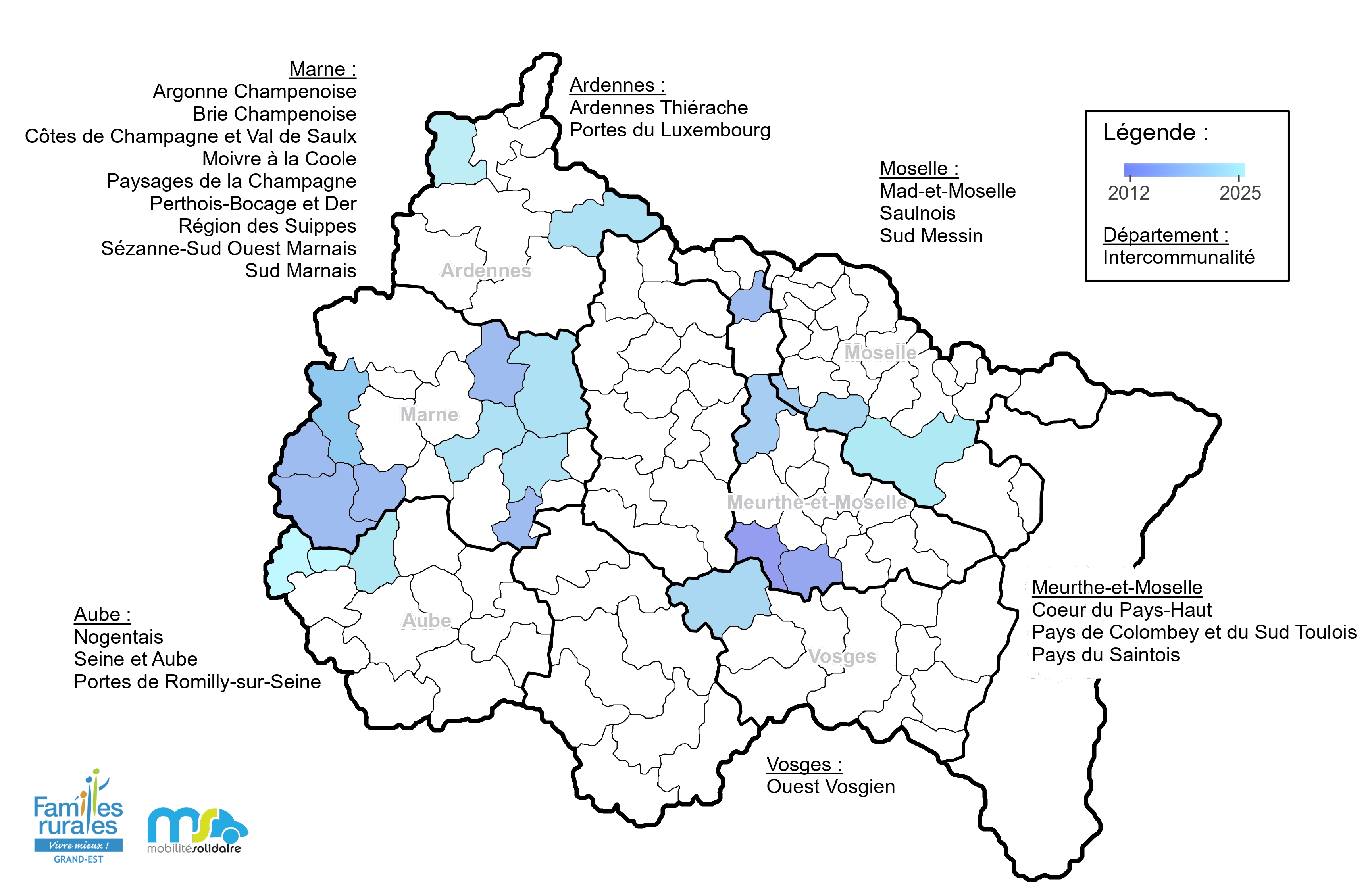 Mobilité Solidaire est déployé à l’échelle Grand Est par Familles Rurales, depuis plus de 10 ans. Le projet est porté par le Mouvement Familles Rurales au travers de ses Fédérations et associations locales, avec le soutien des Communautés de Communes et de partenaires techniques et financiers.