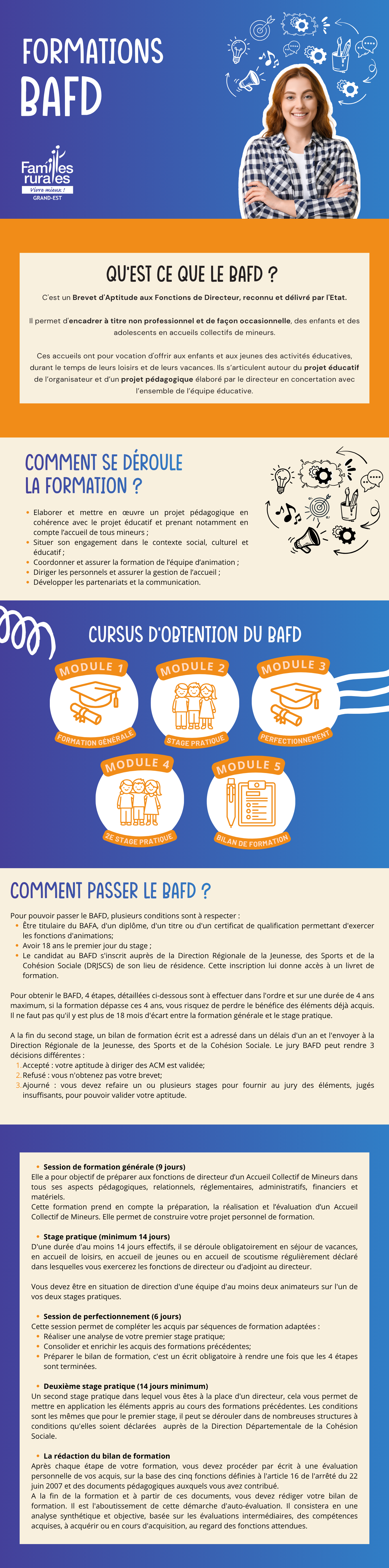 | 15€ de réduction par session sur présentation de la carte adhérent familles rurales. | A la fin du cursus, aide de la Caisse Nationale d’Allocations familiales (CNAF) de 91,47€ (106,71€ si approfondissement petite enfance) sans conditions de ressources. Remplir le formulaire Cerfa n°11381*02 et le renvoyer à la CAF avec un RIB dans les trois mois suivants la fin de la session de formation. | D’autres aides financières peuvent être également accordées par le Pôle Emploi ou par les Comités d’Entreprise. Certaines Communautés de Communes ou Mairies peuvent également accorder des aides, généralement sous conditions de ressources. Il faut vous renseigner directement auprès de ces organismes. |